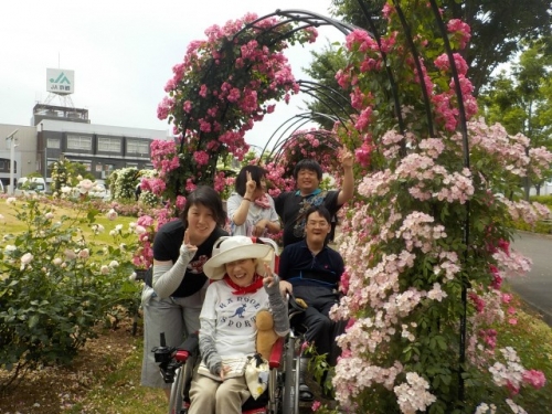 2度目はとても暑い日でしたが、バラは満開で「今日も行きたい、今日行かなバラが見れなくなる」と言っていたメンバーは、満開のバラ園を見て回ってとても満足しておられる様子でした。他のメンバーも散策したり、遊具で遊んだり、思い思いにバラ園を楽しみました。
