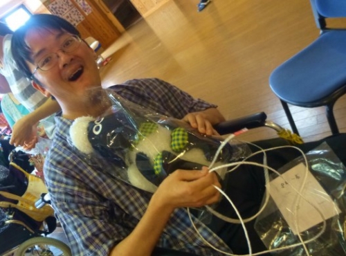8月27日(土)は夏の恒例イベントになっている夏遊びをしました。はっぴを着た職員が待ち構える各コーナーを回って、くじ引きやペットボトルボーリング、風船つかみのゲームを楽しみました。くじ引きの景品でお気に入りのぬいぐるみを見つけてご機嫌な姿もありました。各コーナーを回って最後はみんなお待ちかねのかき氷です。「○○さん何味にする?」と尋ねたり、かき氷を作る職員を手伝ってかき氷器を押さえたりするメンバーもいて、まるで本物のかき氷屋さんのようでした。シロップの代わりにカルピスを掛けてみたり、あんこを乗せてみたり思い思いのかき氷を味わいました。