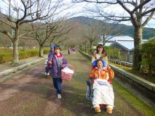 七谷川公園に散歩にでかけました。車道近くの木に数輪の花が咲いていて「何や?梅か?」とメンバーが一言。梅ではなく「十月桜」という種類の桜だそうで、みんな集まって十月桜を観賞しました。川沿いの木々はすっかり葉が落ち、冬の気配も漂う中でしたが、お茶休憩に座ったベンチの側に椛の木がありました。幹を揺らすとひらひらと葉が舞い落ちてしまう程弱々しくですが、木にはまだ葉が多く残っていました。また「あの山にも赤いとこがある!」と遠くの山にも紅葉を見つけ秋の終わりを満喫した散歩になりました。