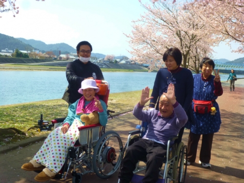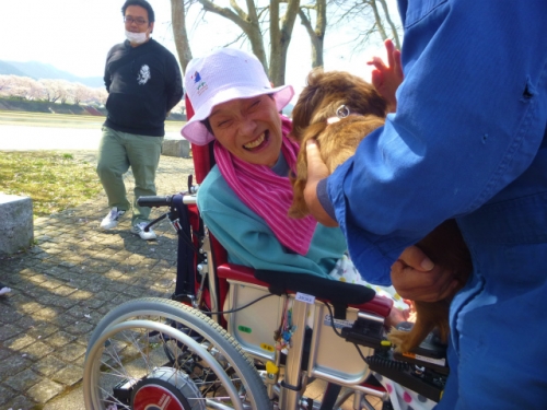 今年の桜は咲いたと思ったら雨続きでゆっくりと眺めることができずにいました。そんな時とっても良いお天気の日がありました。「明日からまた雨やで~!今日しかないで」とメンバーの言葉に押されて、行きたい人を募って八木の河川敷に出かけました。キラキラ光る川面に桜吹雪が舞ってなんとも美しい光景でした!散歩中の犬を抱っこさせてもらったり、お喋りを楽しんだり。本当にリラックスした楽しいひとときを過ごし、みんな大満足のお出かけとなりました。