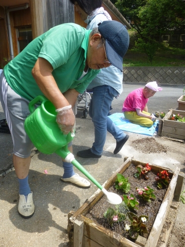 車イスから降りてプランターの前で膝をつき、「どないして植えよ?」と真剣なメンバー、直感でどんどん植えていくメンバー、職員と相談しながら植えていくメンバー等々それぞれの個性が出た花植えになりました。「暑いわ」と言いながらも「水やりする」と早速水をまきました。