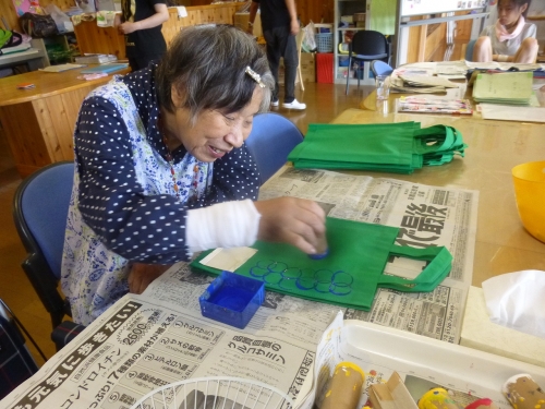 8月の創作の時間は、きょうされん全国大会in京都で参加者に渡すトートバッグの制作に取り組みました。下地となる緑色のトートバッグにメンバー達で色を付けていきます。絵筆で花や景色を描いたり、ローラーやスタンプで模様を作ったり、中には絵の具を手に塗って派手な手形の柄に挑戦するメンバーもいました。次はどんな色にしようか、この道具でどんな模様にしようかと悩みながら作るメンバーもいれば、ただひたすらに黙々とスタンプを押し続けるメンバーもいて、とても個性的なバックが作れました。ぽれぽれのメンバーが特に気に入って描いているのは、ロールの芯を使ったスタンプで沢山の丸をぽんぽんと餅つきのように押したデザインです。他の道具や色と合わせながらカラフルな模様のバックがたくさんできあがりました。