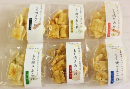 京都丹波産のもち米をお餅にして、うすく切ってから天日干し。地元のおいしいお醤油だれをぬってあぶった「あまから」、かたくちいわしをお餅にまぜて焼いた「おさかな」など、お米の風味を堪能できる、おいしいあられです。